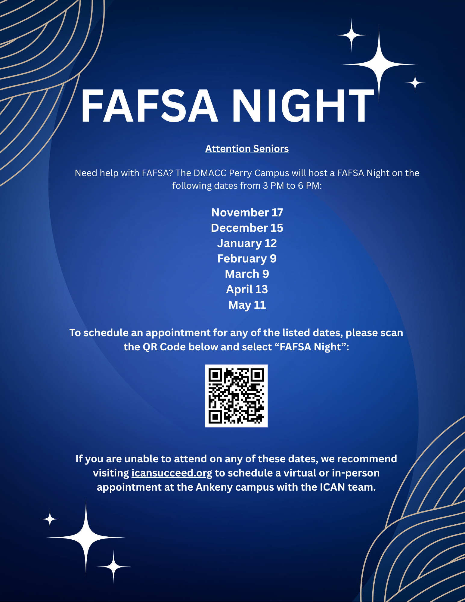 Attention Seniors Need help with FAFSA? The DMACC Perry Campus will host a FAFSA Night on the following dates from 3 PM to 6 PM : November 17 December 15 January 12 Februa. . .